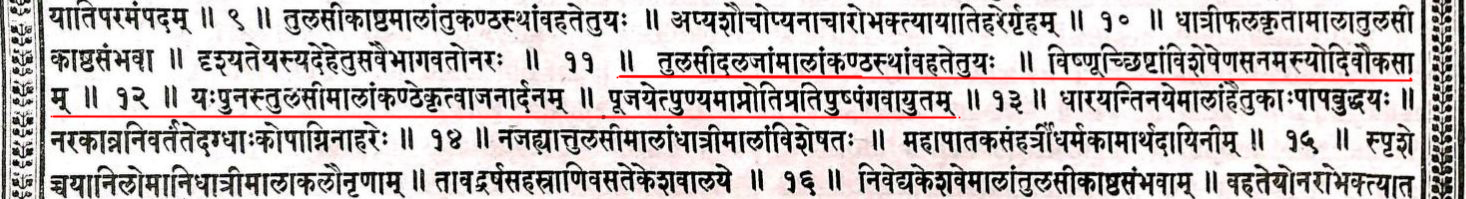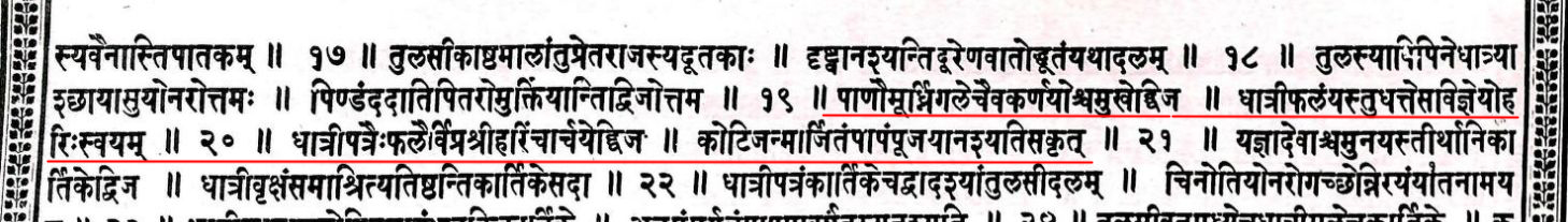 Along with Tulasi, Dhatri (Amla) fruit is praised as very auspicious. The man on whose body is seen the beads made of Dhatri fruits or Tulasi, is a devotee of Vishnu. He who, puts round his neck the garland of Tulasi, would worship Vishnu, obtains for each flower, plenty of cows.