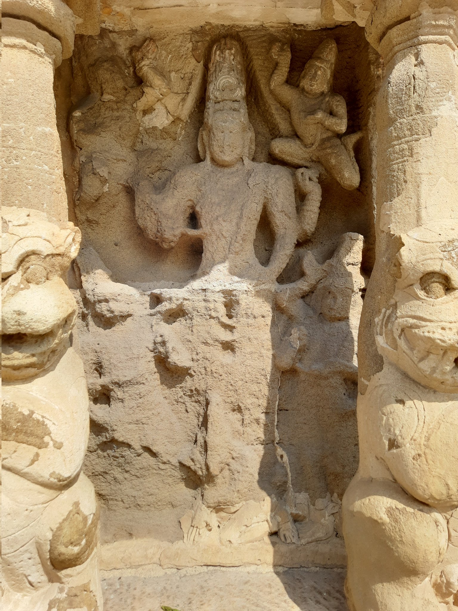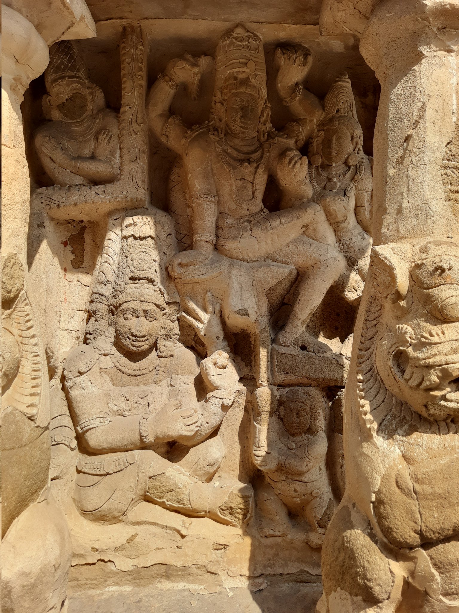 The Anga alaya facing north east depicts Shiva performing the Samhara Tandava. This time he is being witnessed by devi shown here as Bhavani. It also shows ganas and attendants playing musical instruments.
