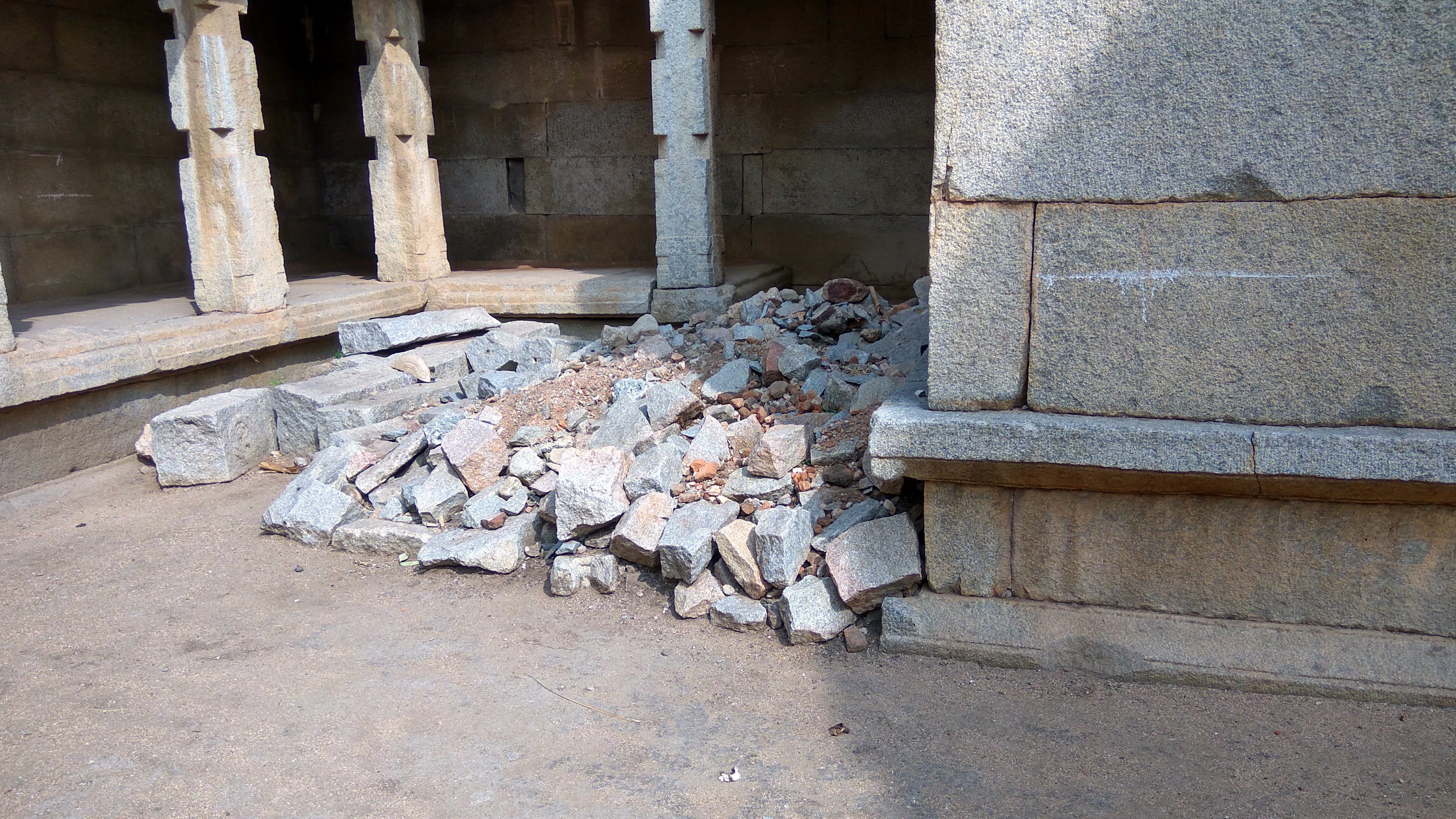 Bhairava. He his accompanied by his vahana Shvana (dog). Interestingly he holding the Abhaya & Varada mudra with his arms (damaged here) as opposed to any weapons we are used to seeing. There are an additional 8 aspects of Bhairava depicted at the temple. I'll write about those in the separate post.