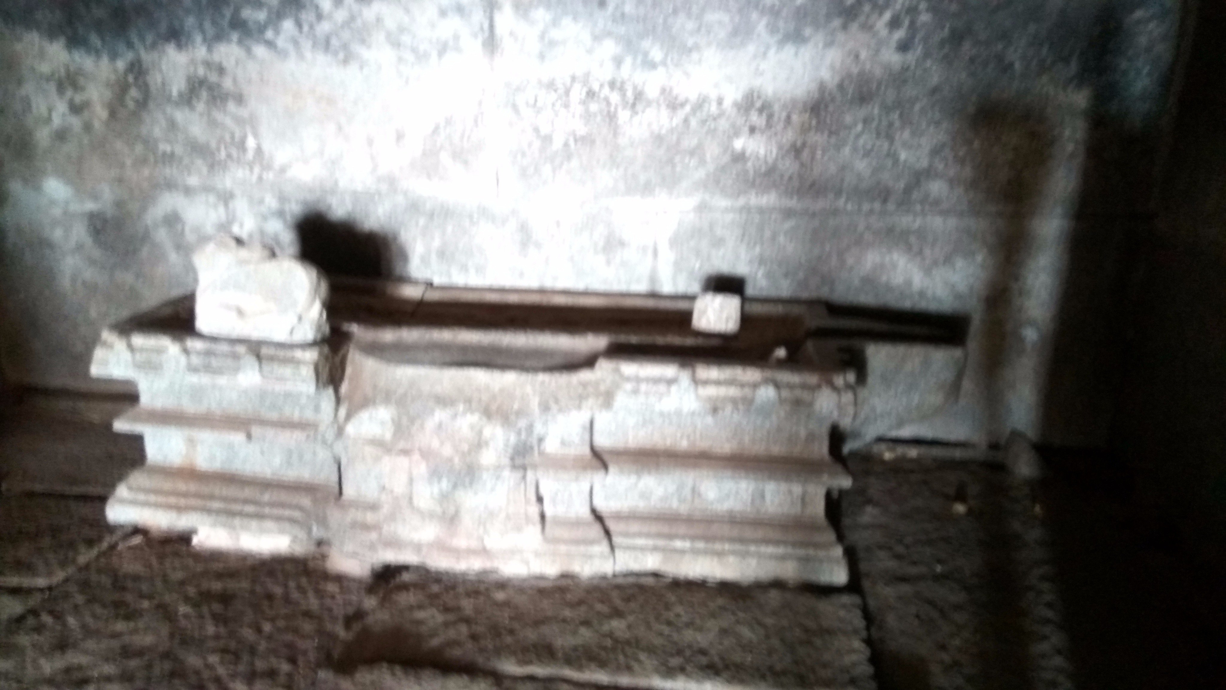 Ekapadamurthi. Here Shiva is depicted as one legged & 4 armed with torsos of Brahma & Vishnu appearing on either side. Together referred to as Ekapada-trimurthi. Lord Shiva holds a Trishula & Tanka in his rear arms while keeping the varada & abhaya mudra in the front arms. The Vishnu aspect is unfortunately damaged in the stucco sculpture.