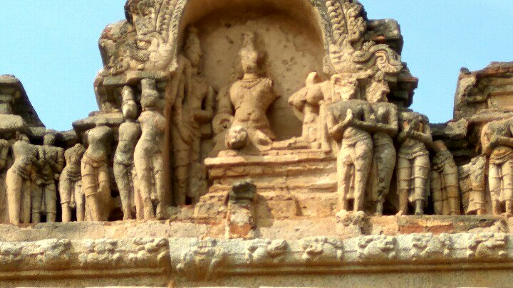Just as the chariot is about to fall, Maha Vishnu stabilizes & prevents the chariot from falling. Vishnu for a moment is filled with pride that he is the only one in the entire universe capable of bearing the weight of Shiva.