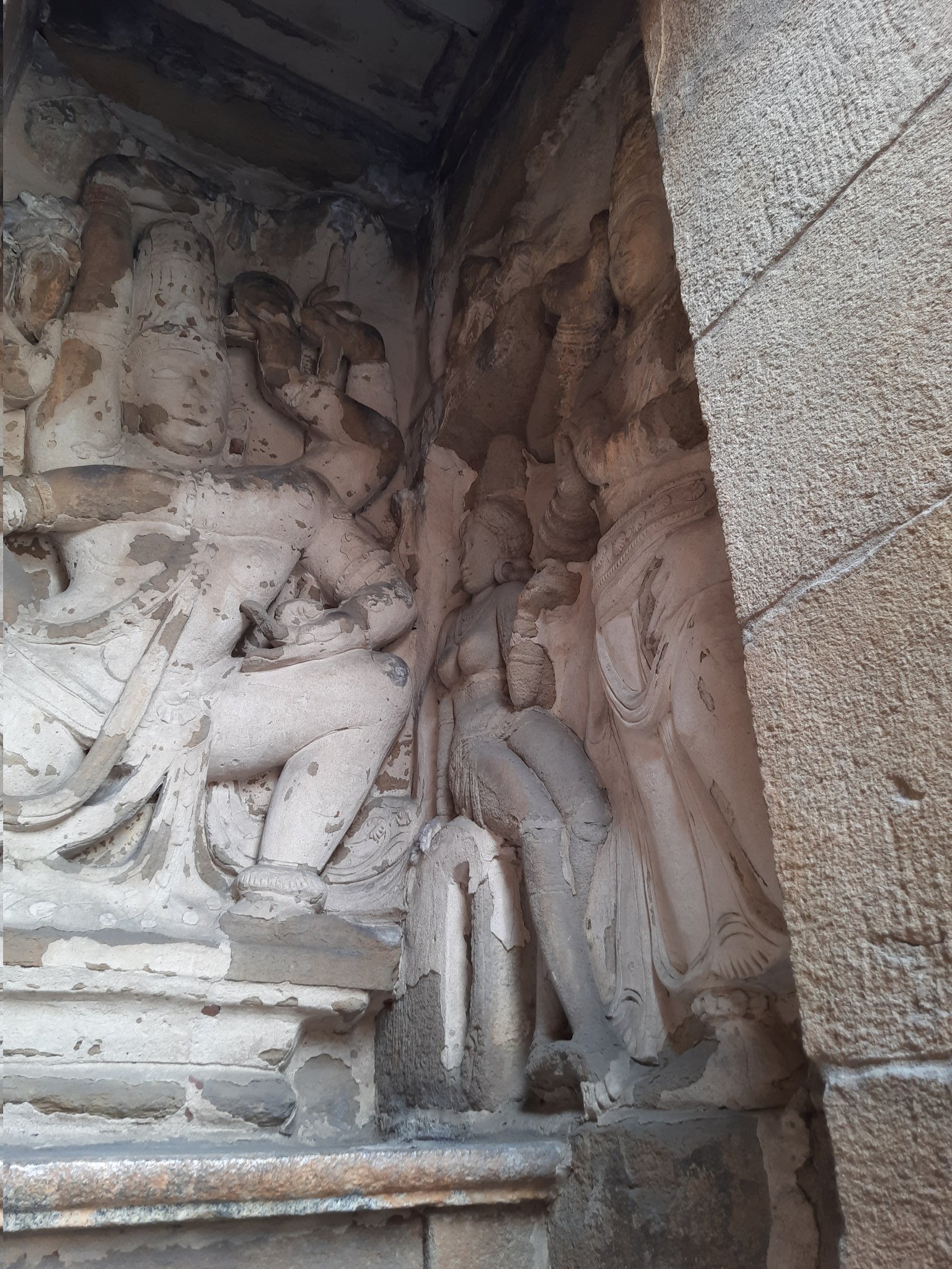The Anga alaya facing north east depicts Shiva performing the Samhara Tandava. This time he is being witnessed by devi shown here as Bhavani. It also shows ganas and attendants playing musical instruments.