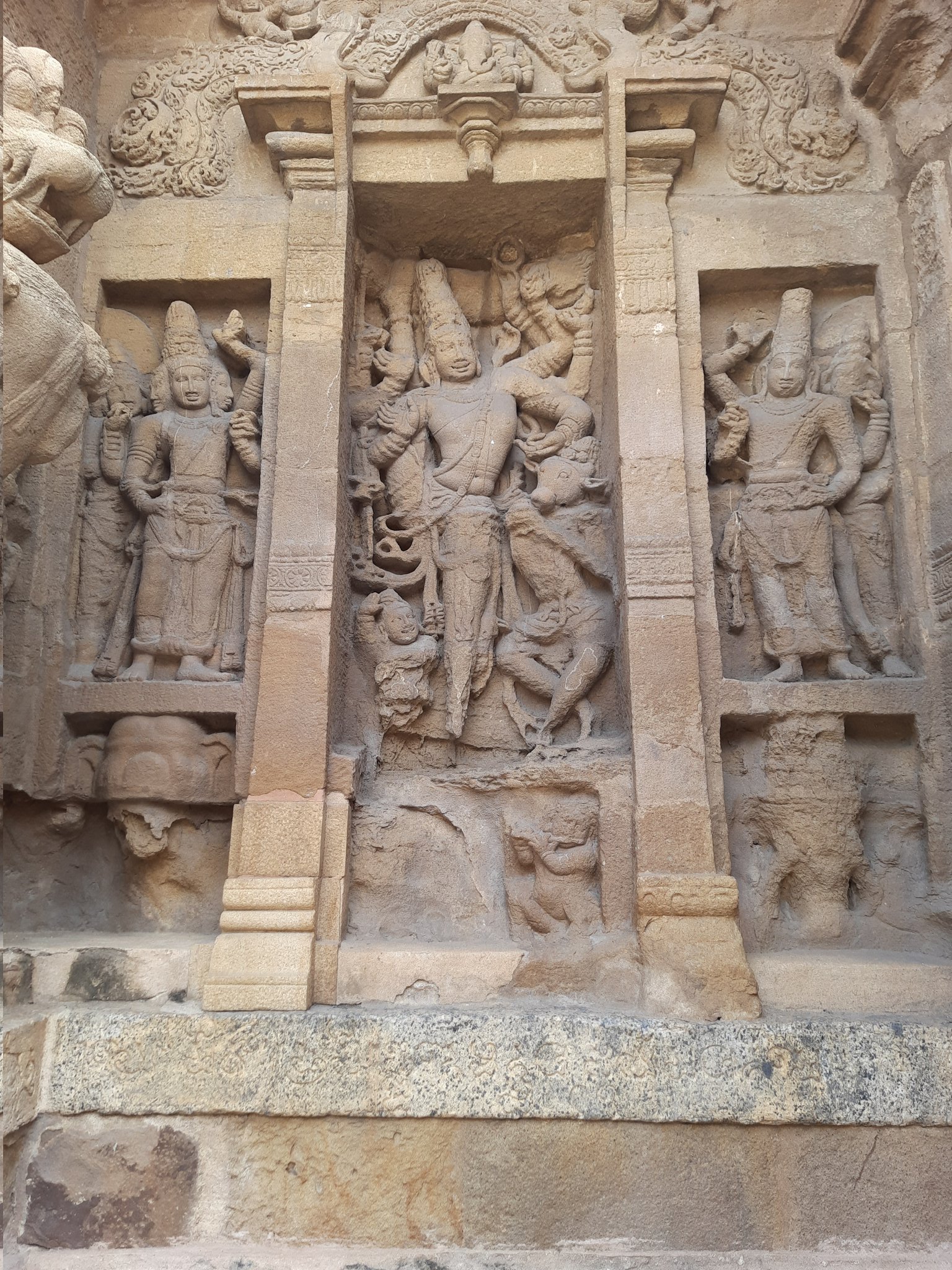 The Anga alaya facing north east depicts Shiva performing the Samhara Tandava. This time he is being witnessed by devi shown here as Bhavani. It also shows ganas and attendants playing musical instruments.