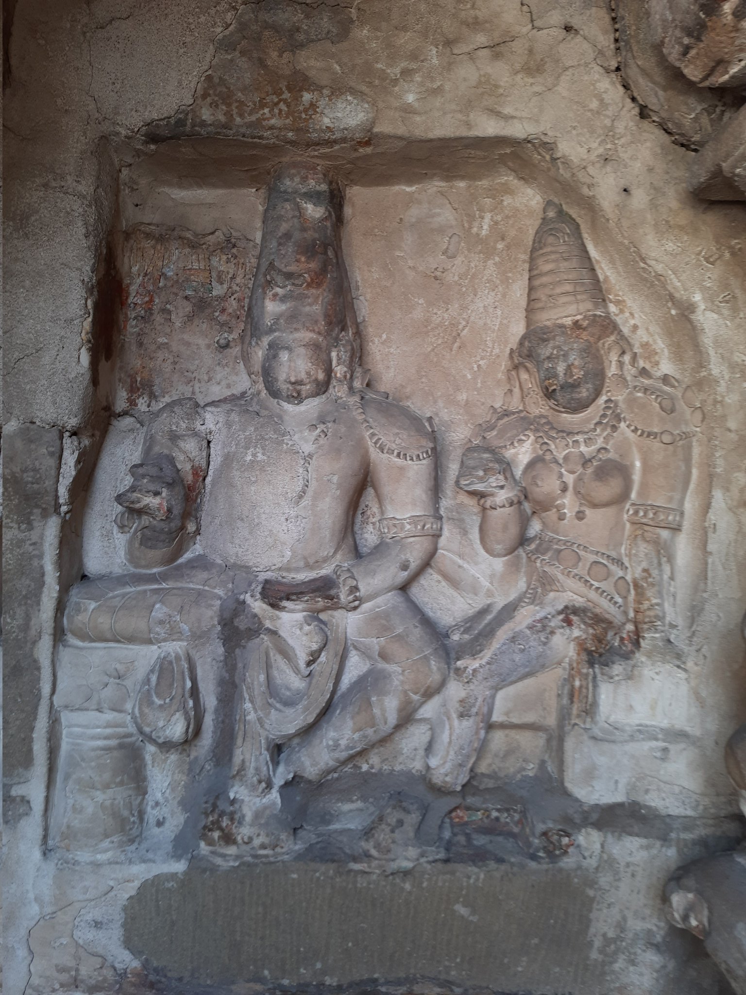 The Anga alaya facing north depicts Shiva flanked on either side by Brahma and Vishnu. Uma is seen on the right wall.