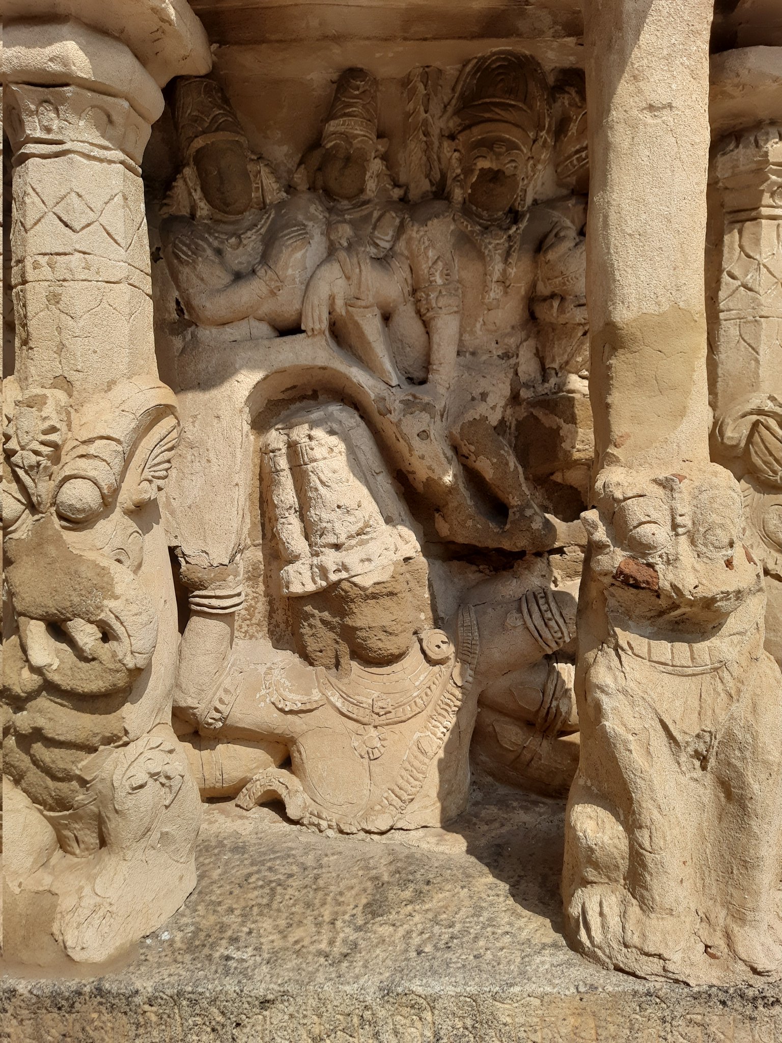 The front Mantapa has a number of important inscriptions, including that of Chalukyan king Vikramaditya. When he defeated Pallava Nandivarman, he was enchanted by the beauty of this temple & made huge gifts of gold. The inscription records the gift.